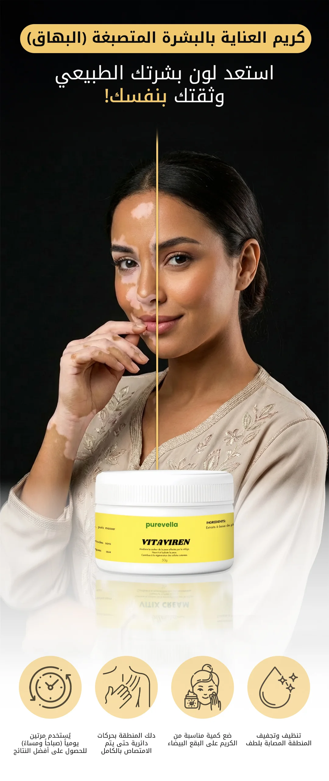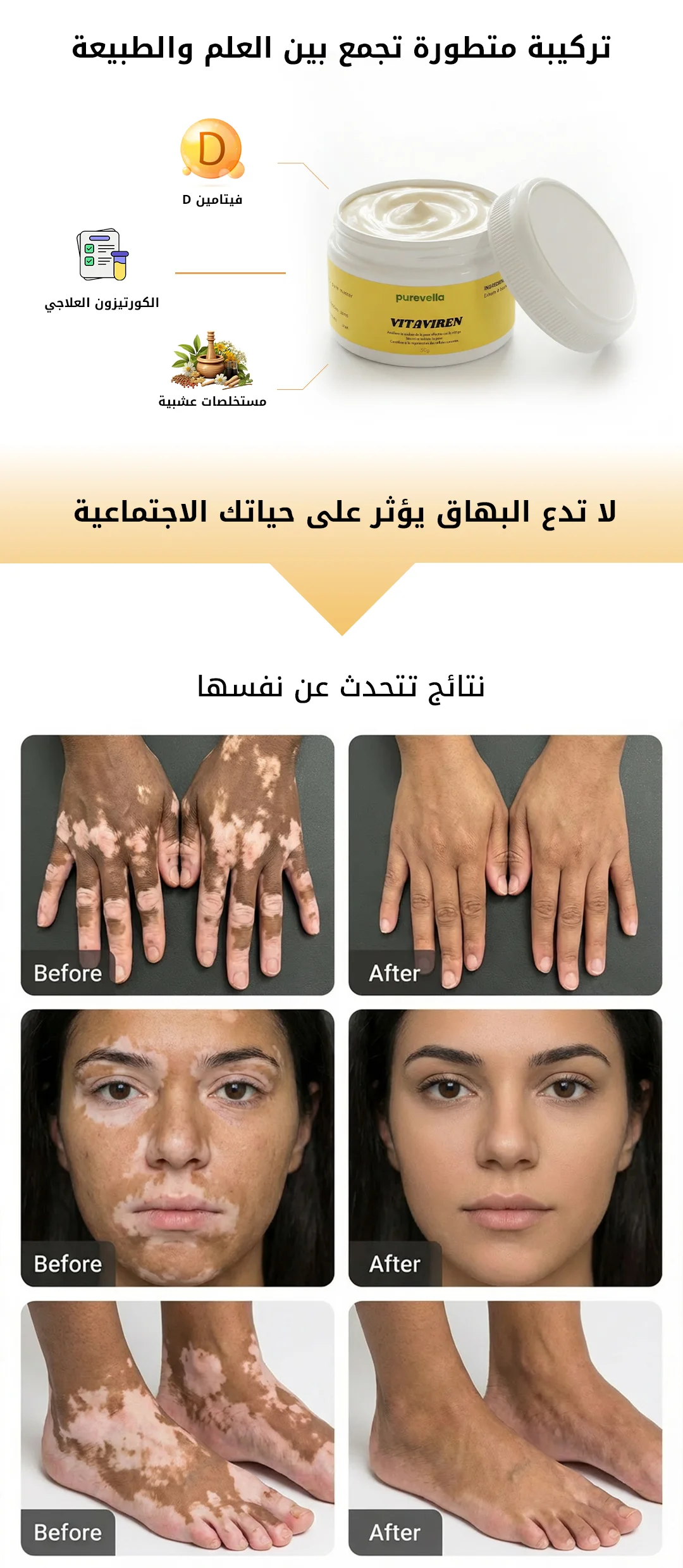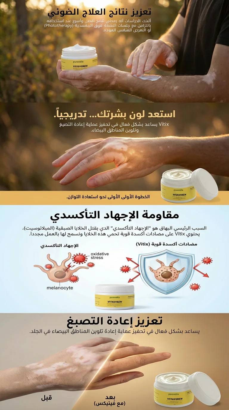 لا تدع البهاق يؤثر على حياتك الاجتماعية! التعامل المبكر مع المناطق الفاتحة يعطي نتائج أسرع بـ 3 مرات. تركيبتنا تساعدك على استعادة التجانس ومنع الجفاف الذي قد يفاقم التفاوت اللوني. ابدأ رحلة العلاج اليوم ولا تتردد.